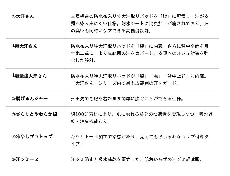 「汗ジミが気になる体の部位」ランキングでは、1位:「脇」(92.1%)、2位:「背中」(48.6%)、3位:「胸・胸元」(41.7%)という結果でした。この上位3箇所に防水布入り汗取りパッドを内蔵した「超最強大汗さん」が今年新登場しました。
