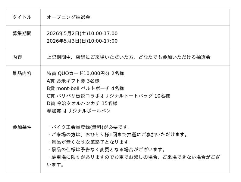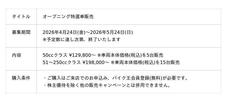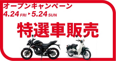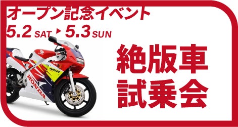 今回、オープニングイベントとして、豪華景品が当たる抽選会のほか、希少な絶版車の試乗会、特選車販売や期間中に当店舗で126cc以上のバイクをご購入された方を対象にVポイントを進呈するキャンペーンを実施します。ベテランライダーの方はもちろん、これからバイクに乗り始める方やご家族にも楽しんでいただける企画をご用意して皆様のご来店をお待ちしております。