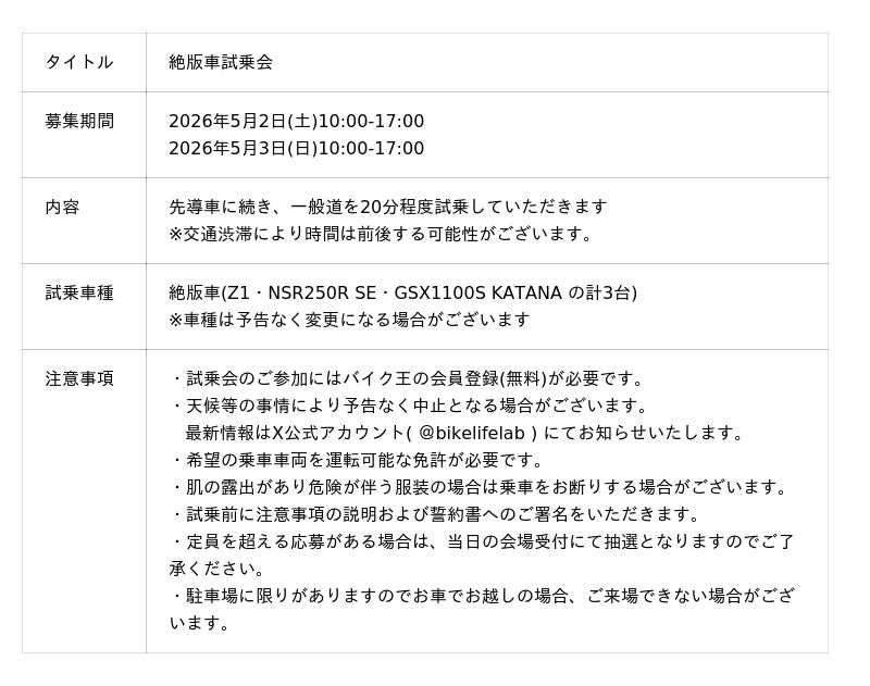 絶版車ならではの乗り味を体感いただける機会として、現行車との違いも含めてお楽しみください。