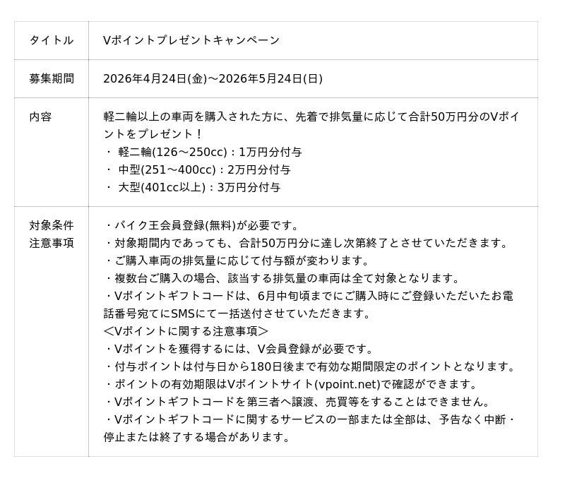 4月24日(金)~5月24日(日)の期間、ご購入いただいた方を対象に、先着で合計50万円分のVポイントを進呈いたします。春のバイクシーズンに、買い換えはもちろん、新たにバイクに乗り始める方々にもお得なキャンペーンとなっておりますので、この機会にぜひご利用ください。