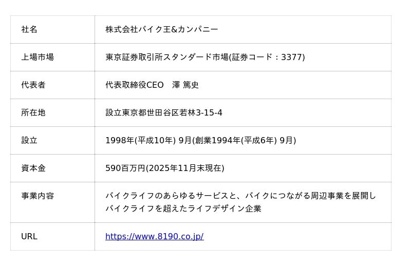 株式会社バイク王&カンパニーは、1994年9月に創業。中古バイクの買取・販売を主力事業とし全国に店舗を展開するほか、バイクの整備・パーツ販売・レンタルなど、バイクライフを総合的にサポートしています。近年は、バイクだけでなく電動モビリティなど、バイクライフを超えた幅広いモビリティ関連事業へと領域を拡大しています。