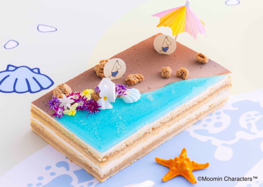 「シーサイドムーミンケーキ」ビーチでムーミンが貝拾いをするシーンから着想を得た、バナナやパッションフルーツを使った夏仕様のオペラケーキ。ザクザクとしたピーカンナッツの香ばしさと食感が滑らかなケーキとのコントラストになっています。