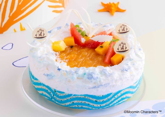 「パラソルの下のムーミンたち」 ムーミンママが、テーブルにドリンクをこぼしてしまい、恥ずかしさのあまりパラソルの下にみんなで隠れながら食事をした一幕を再現。愛らしいムーミン一家のおしりが並んだホールケーキには、グアバやピーチコンポートなどを使い、夏らしい爽やかなフレーバーを楽しめます。