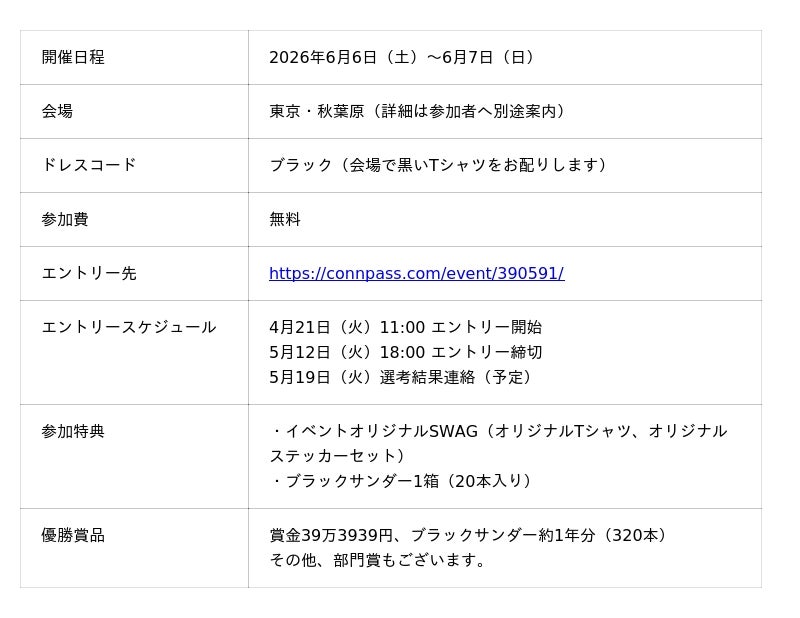 本イベントはエンジニアの方を対象に、2026年4月21日(火)よりエントリーを開始します。優勝チームにはブラックサンダー約1年分(320本)と、賞金39万3939円を贈呈します。