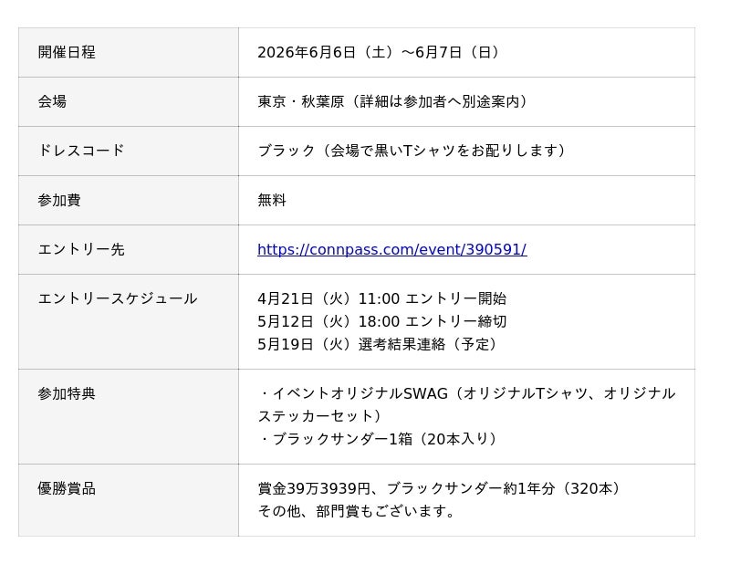 本イベントは、ブラックサンダーの新しい楽しみ方として「パソコン作業のおとも」という食シーンを提案し、より多くの方へ広めていく取り組みです。開発の合間にブラックサンダーを食べて“ひと息”入れながら進める新たな開発手法「ブラックサンダー駆動開発(BTDD - Black Thunder Driven Development)」を導入する、ブラックサンダー食べ放題のハッカソンを、2026年6月6日(土)・7日(日)の2日間、東京・秋葉原にて初開催します。