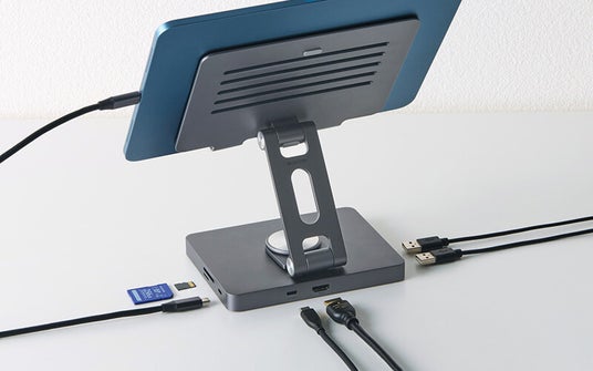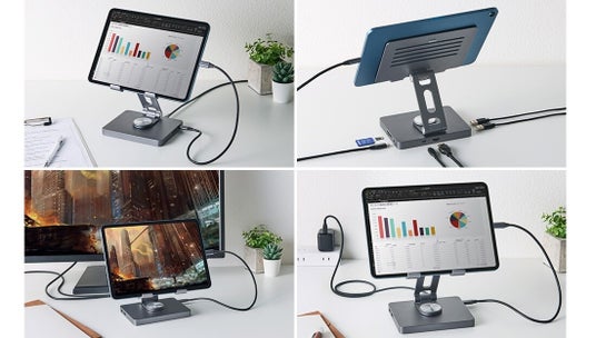 タブレットの操作性と拡張性が同時に向上するドッキングステーション機能付きのタブレットスタンドです。USB Power Delivery(最大入力100W)に対応した充電専用USB Type-C(TM)ポート×1を搭載し、充電しながら作業できます。また、最大4K出力に対応したHDMI(R)ポートを搭載し、タブレットの映像を大型ディスプレイに複製・拡張して表示可能です。さらに、USB 5Gbpsの高速データ通信に対応したUSB-Aポート×2に加え、SDカード用とmicroSD用のカードスロットを各1基搭載し、さまざまなデバイスとのデータ交換もスムーズに行えます。アルミ素材を採用したスタンドは13インチまでのタブレットに対応し、高さや角度の調節に加え、左右に360度回転可能で、最適な姿勢や目線で視聴できます。使わないときは厚さ約6cmに折りたたみ、コンパクトに収納できます。