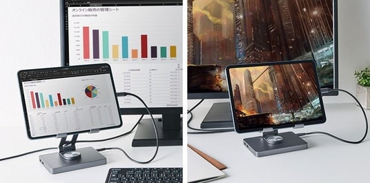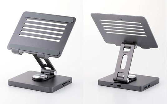 エレコム株式会社(本社:大阪市中央区、取締役社長執行役員:石見 浩一)は、6ポートのドッキングステーション機能を備え、ポート拡張や映像出力に対応するアルミ筐体のタブレットスタンドを4月下旬より新発売いたします。