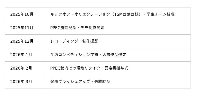 ▶ 背景と目的PPECが2026年の開業5周年を迎えるにあたり、施設の魅力をさらに高めるため「館内公式BGM」の制作のプロジェクトを企画。エンターテインメント業界の即戦力育成に定評のあるTSMと連携し、学生が実践的な環境で楽曲制作に挑むプロジェクトとして始動しました。