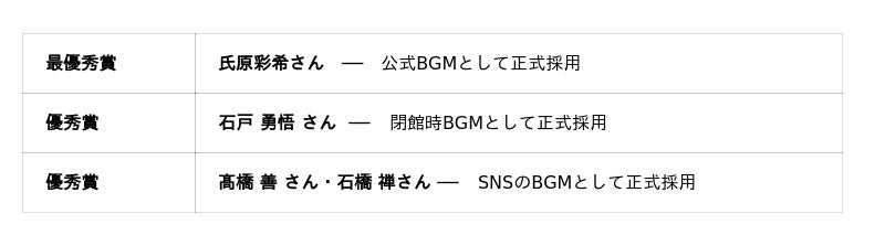 施設で過ごすのに適した心地よいテンポ感の楽曲に加え、ワークショップなどの活動時に流すのに適した楽曲も制作されており、場面に応じて使い分けられる点が複数の審査員から支持を集めました。