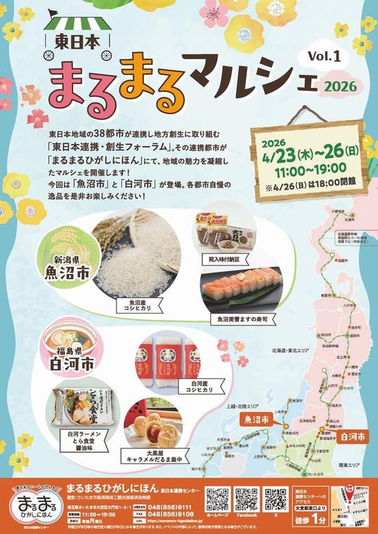 まるまるひがしにほんでは、4月23日(木曜日)から26日(日曜日)まで「東日本まるまるマルシェ2026 Vol.1 」を開催します。東日本地域の38都市が連携し地方創生に取り組む「東日本連携・創生フォーラム」。その連携都市が「まるまるひがしにほん」にて、地域の魅力を凝縮したマルシェを開催します。