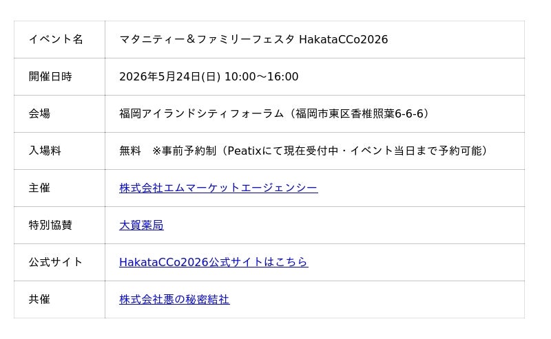 特撮コンテンツを活用した広告宣伝・販売促進などを手掛けるエムマーケットエージェンシー(福岡市、代表取締役:下青木秀輝)は5月24日、福岡アイランドシティフォーラムで、マタニティ&ファミリー向けイベント「HakataCCo2026(ハカタッコ)」を開催いたします。福岡で子育てを頑張る親子の美と健康を応援する催しで、前年は過去最多の7840人の来場を記録。今年はワークショップやステージパフォーマンスなどさらにパワーアップしたコンテンツが満載です。入場無料・完全予約制で、親子が安心して1日中楽しめるイベントです。