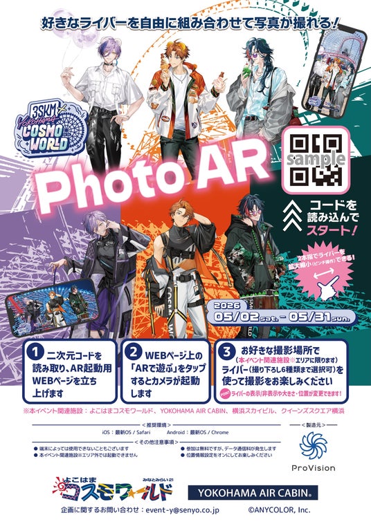 株式会社サイバーエージェント(本社:東京都渋谷区、代表取締役:山内隆裕、東証プライム市場:証券コード4751)は、VTuberグループ「にじさんじ」所属の男性ユニット「3SKM(スリーエスケーエム)」と都市型立体遊園地「よこはまコスモワールド」のコラボレーションキャンペーンを、2026年5月2日(土)より開催することをお知らせいたします。