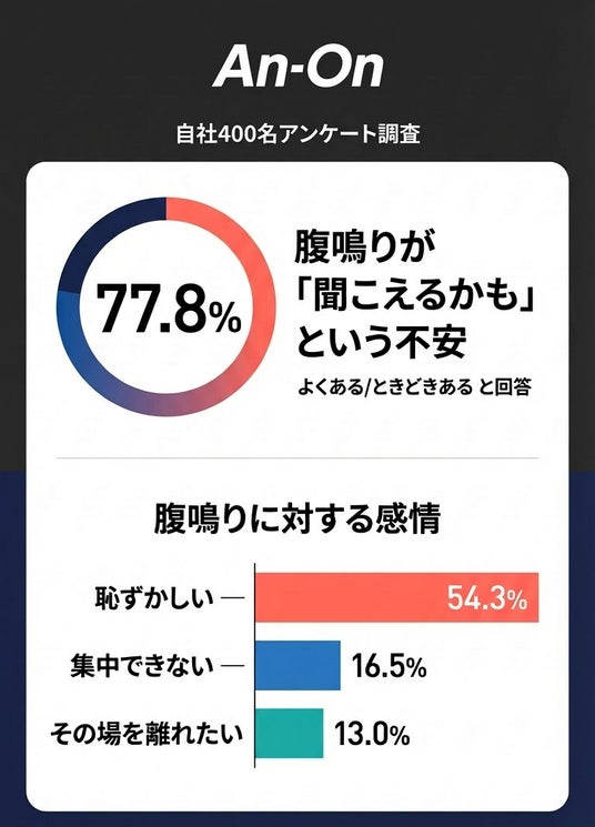 過去に「おならの音とニオイを軽減するパンツ」で達成率735%を記録した「Toride Pants」のプロジェクトに寄せられた、「お腹の鳴る音も遮音できるアイテムが欲しい」というユーザーの切実な声から、この「An-On」プロジェクトは誕生しました 。自社で実施した400名のアンケート調査で、実は77.8%の人が「お腹の音が周囲に聞こえるかもしれない」という不安を抱えていることが明らかになりました 。特に「恥ずかしい(54.3%)」「集中できない(16.5%)」といったメンタル面への影響が大きく、静かな空間での腹鳴りは日常的なストレスとなりQOLを低下させています 。
