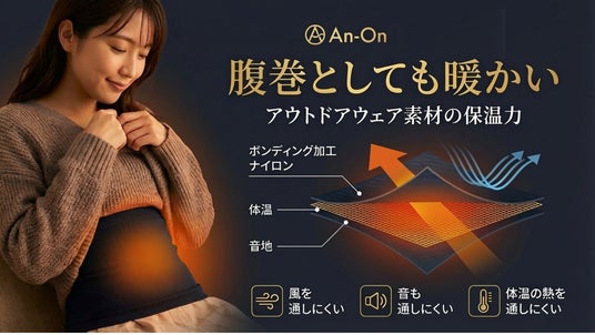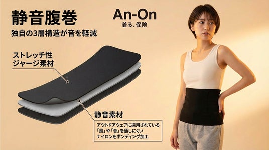 岡山を拠点にQOL向上アイテムを展開する株式会社Toride は、コントロールが難しい急な「腹鳴り(お腹の鳴る音)」を独自の3層構造で軽減する、静音腹巻「An-On」を、2026年4月21日(火)12:00より、応援購入サービスMakuakeにて先行販売を開始いたします。