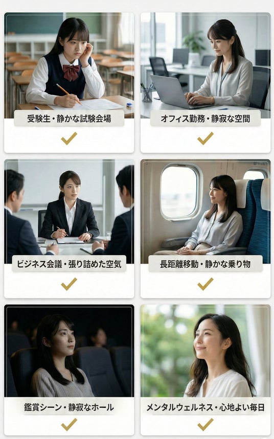 受験・試験会場:静まり返った教室内での試験中に。ビジネス会議:張り詰めた空気の会議室やプレゼン中に。