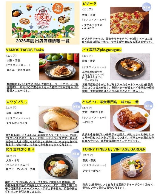 今年で5回目となる本イベントには、関西人が本当においしいと認める飲食店が、過去最大の60店舗が集結!メニュー被りなしのラインナップで、多彩な食をお楽しみいただけるフードフェスです。毎年大人気の毎日放送の番組オリジナルグルメは「よんチャンTV」の人気コーナーからイベント限定メニューの出店が決定!そのほか、子どもから大人まで楽しめる体験コンテンツやステージイベントも充実。家族・友人・カップルで、ペットと来ても、1日中楽しめるイベントです♪ 5回目の「スマレジ presents はらぺこサーカス」が、過去最大規模の開催で大阪のゴールデンウィークを盛り上げます!