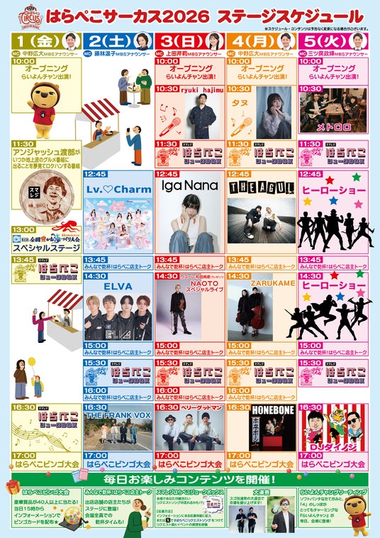 株式会社毎日放送(大阪市北区茶屋町17番1号)は、 2026年5月1日(金)~5月5日(火・祝)の全5日間、花博記念公園鶴見緑地 大芝生(大阪市鶴見区)にて『スマレジ presents はらぺこサーカス』を開催いたします。入場無料。