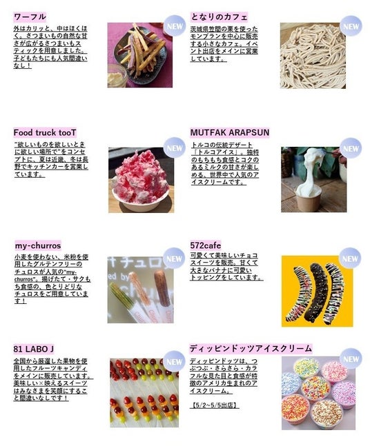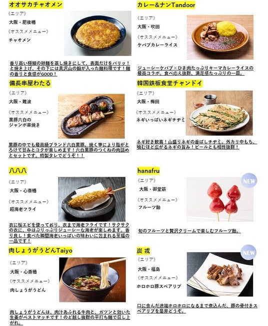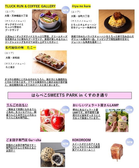 大阪・新町で24年続くTrattoria Pappaからは、イベント限定メニュー「鉄板焼きスパゲッティナポリタン」が、和歌山・朝来で創業50年を迎える中華料理 獅子林から「手羽先唐揚げ」が登場。そして、人気店のイベント限定復活も!大阪・堺筋本町で惜しまれながら閉店したビストロ ルヌーパピヨンが本イベントで限定復活し、熟練の技で「牛ハラミステーキ」を提供します。また、スイーツも充実!大阪・御堂筋のフルーツスイーツの人気店 hanafru からは「フルーツ飴」が、兵庫・川西のいちご農園が手掛けるスイーツ専門店いちごICHIJUからは「いちごパフェ」が登場。メニュー被りなしの60店舗が勢ぞろいするので、必ず食べたいものが見つかります!