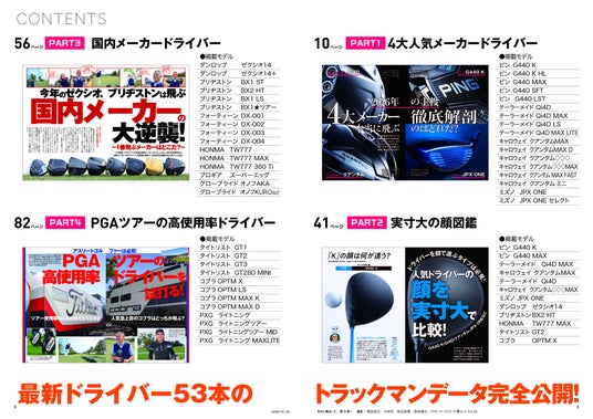 2026年に登場した新作ドライバーと、まだまだ人気のドライバーを弾道計測器「トラックマン」を使って計測し、ヘッドスピード別に測定したデータを一挙公開。いま欲しいドライバーの飛距離性能は? どのスペックを選べばいいの? という疑問に答える一冊に仕上がっています。