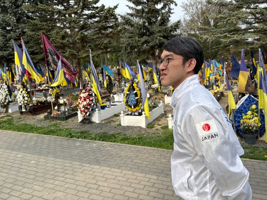 墓地の花は最近人が亡くなったことを、国旗はそれが戦死者であることを意味する。国旗の数は急増していると現地スタッフのコーシャは語る。(2026年3月撮影) (C)テラ・ルネッサンス