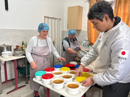 すでに稼働している炊き出しキッチンポイントにて。支援対象者の自宅を1軒1軒、手渡しで回る。(2026年3月撮影) (C)テラ・ルネッサンス