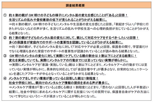 e-ラーニングに関するサービスの様々なコンテンツを提供する株式会社イー・ラーニング研究所(代表取締役:吉田智雄、本社:大阪府吹田市 以下、イー・ラーニング研究所)は、子どもがいる親世代を対象に「GWのメンタル低下に関する意識調査」を実施いたしました。