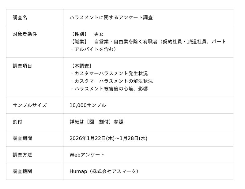 株式会社アスマーク(本社:東京都渋谷区、代表取締役:町田正一)が展開する、従業員総活躍サービス「Humap(ヒューマップ)」は、全国の有職者10,000人を対象に実施した「カスタマーハラスメント(カスハラ)被害の実態調査」のレポートを4月10日(金)に公開いたしました。