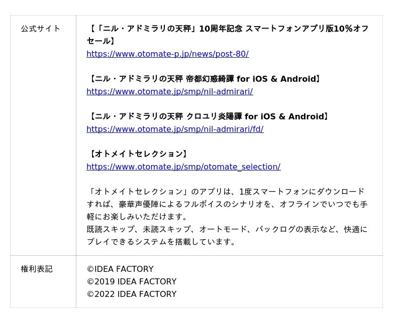 女性向けゲームブランド「オトメイト」を手掛けるアイディアファクトリー株式会社は、2026年4月21日(火)より、第1作目の発売から10周年となる女性向け恋愛アドベンチャーゲーム「ニル・アドミラリの天秤」について、スマートフォンアプリ版2作品の10%OFFセールを開催いたします。