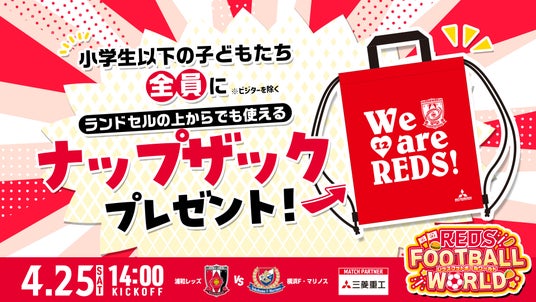 さらに「REDSグルメワンダーランド supported by 三菱重工 ‐世界を食べ尽くせ! ワールドグルメフェス‐」では、世界48か国のグルメがずらりと並び、スタジアムが”世界の食フェス“に。遊びながら、食べながら、自然とサッカーに触れられる、友人や家族と一日満喫できる時間をお届けします。また、小学生以下の来場者にはナップザックをプレゼントし、お子さまもより楽しめる内容となっています。
