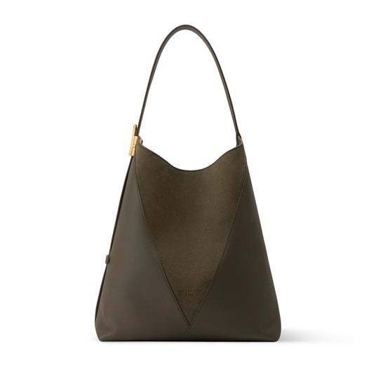 ガストン-ルイ・ヴィトンのパーソナライズされたトランクを想起させる「V」字パネルをあしらった「ホーボー MM」。カーフレザーとスエードを組み合わせたタイムレスなアースカラーの色合いで仕上げ、ゴールドカラーの金具がエレガントな印象をプラス。ノートパソコンやノートなどの日常の必需品が収納できる、ゆったりとしたサイズ。