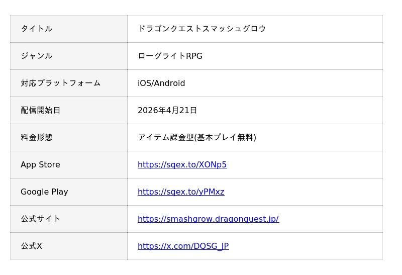 株式会社スクウェア・エニックス(本社:東京都新宿区、代表取締役社長:桐生 隆司 、以下スクウェア・エニックス)は「ドラゴンクエスト」シリーズ新作のスマートフォン向けローグライトRPG『ドラゴンクエストスマッシュグロウ』において、本日4月21日(火)に正式サービスを開始いたしました。ゲーム内では、リリースを記念したキャンペーンを開催中です。