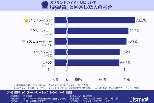 「高品質」というイメージが当てはまると回答した割合は、『アミノメイソン(Amino Mason)』が73.3%、『ドクターハニー(DR.HONEY)』が70.6%、『ウィズビューティー(WITH BEAUTY)』が69.8%、『コンクレッド(CONCRED)』が66.9%、『レバタ(Levata)』が66.8%でした。
