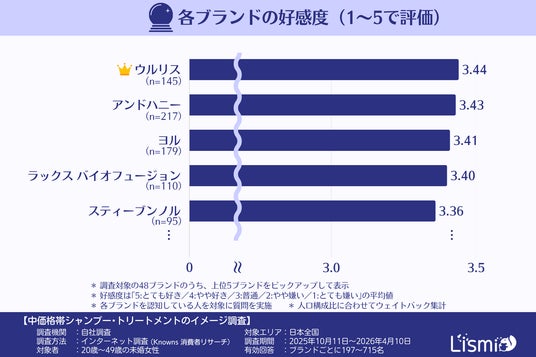 好感度の平均値は、『ウルリス(ululis)』が3.44、『アンドハニー』が3.43、『ヨル』が3.41、『ラックス バイオフュージョン(LUX BIO FUSION)』が3.40、『スティーブンノル(STEPHEN KNOLL)』が3.36でした。3.4前後の狭い範囲で、各ブランドが拮抗するという結果です。