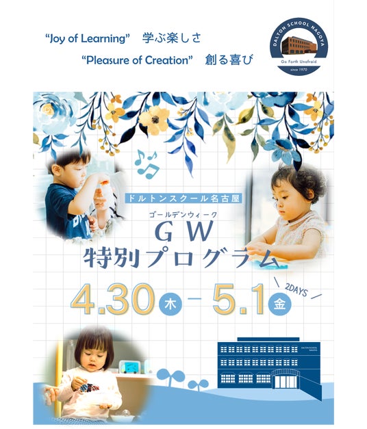 幼児・児童教育を行う河合塾グループのドルトンスクール名古屋校は、1・2才児、小学1~3年生を対象にしたGWの特別プログラムを4月30日(木)・5月1日(金)の2日間開催します。年令、学年に応じたテーマのもと、子どもたちの学びを支援します。1才児・2才児は保護者の方と共にご参加いただきながら、子どもの知的好奇心を喚起する独自のプログラムを体感できます。