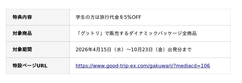 日本空輸株式会社(本社:東京都港区、代表取締役:岡下 敏也)が運営する旅行予約サイト『グッドトリップエクスプレス(グットリ)』は、好評につき、サークル合宿、友人との週末旅を全力でサポートする『格安学割ツアー』の継続販売を開始いたしました。限られた予算の中で、「あと一回多く旅に行きたい」「ワンランク上の体験をしたい」という学生の皆さまの願いを、航空券+宿泊のセット価格ならではの圧倒的なコストパフォーマンスで叶えます。