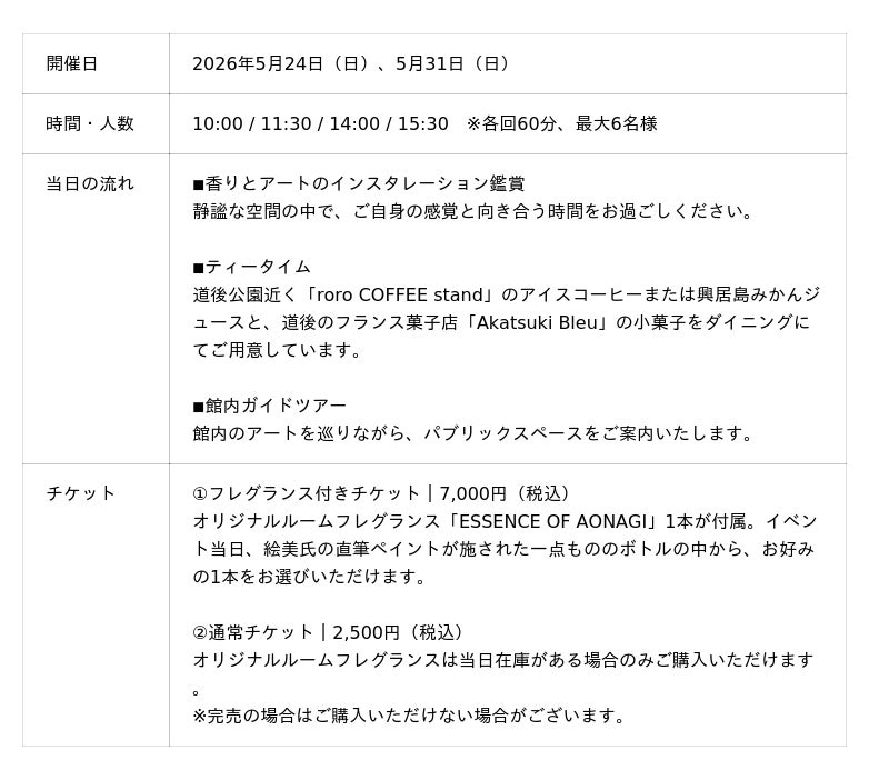「旅の目的地となる宿(=デスティネーションホテル)」をプロデュースする株式会社温故知新が運営する、「瀬戸内リトリート 青凪 by 温故知新」(所在地:愛媛県松山市、総支配人:下窪 日登美)は、香りとアートのインスタレーション「The Fragrance of Art」を、2026年5月24日(日)・31日(日)に開催いたします。