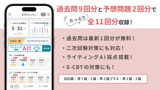 教育出版社の株式会社旺文社(東京都新宿区、代表取締役社長 粂川 秀樹)は、実用英語技能検定(以下、英検)の過去問学習ができるwebサービス「受験生のための英検(R)カコモン」(準1級~3級対応)に、新たに2025年度第1回の過去問を搭載しました。無料公開中のライティングAI採点で、AIによるライティング解答の採点・添削が可能です。会員数は3.7万人を超え、英検の過去問をスマホで効率的に対策できるアプリとしてご好評をいただいています。