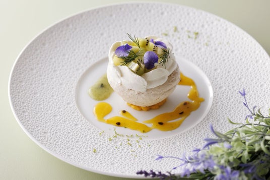 軽やかなココナツのメレンゲにカスタードとライムのスフレグラッセを重ね、キウイやメロンを飾った、見た目も味わいも爽やかなスイーツプレートです。