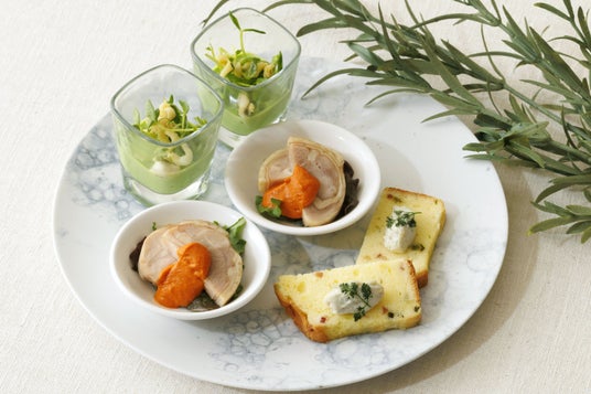<2段目>アスパラとベーコンのパウンドケーキ/鶏もも肉のガランティーヌ/枝豆のムース イカと豆苗のマリネ/