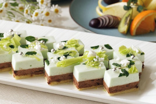 <1段目>ブランマンジェ・ピスターシュ/イチゴとバジルのマカロン/メロンムース/ジャスミンとライチのムース
