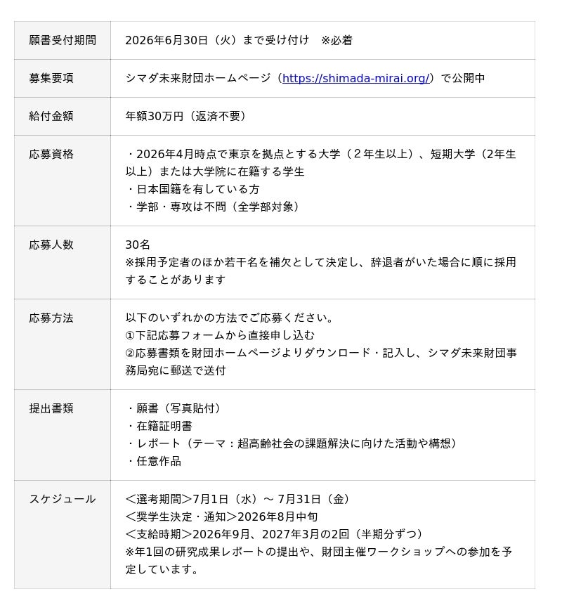 公益財団法人シマダ未来財団(東京都渋谷区/代表理事:島田成年)は、2026年4月15日(水)より2026年度奨学生の募集を開始いたしました。本制度は、学業成績や経済状況ではなく、学生の「志」と「可能性」を重視する給付型奨学金です。多様な分野の学生が、これまでの福祉の枠組みを超えた自由な発想で「超高齢社会」に向き合う挑戦を支援します。