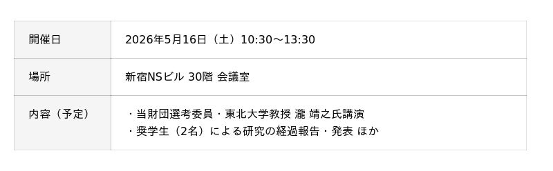 普及啓発事業の一環として、奨学生の研究報告会を以下の通り予定しています。超高齢社会の未来を考えるきっかけとして、どなたでもご参加いただけます。