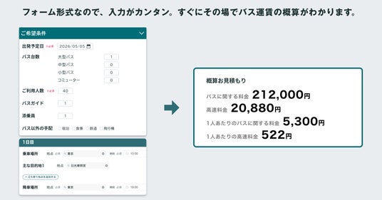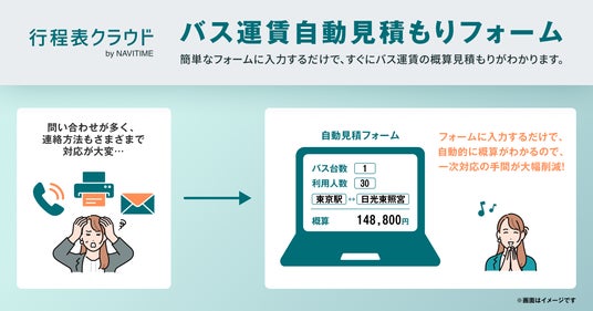 株式会社ナビタイムジャパン(代表取締役社長:大西 啓介、本社:東京都港区)は、2026年4月23日(木)より、大型観光バス対応の行程表作成ツール『行程表クラウド by NAVITIME』にて、貸切バス事業者や旅行会社のWebサイト上で概算運賃の自動計算と見積もり作成を可能にする新機能「バス運賃自動見積もりフォーム」を提供開始いたします。