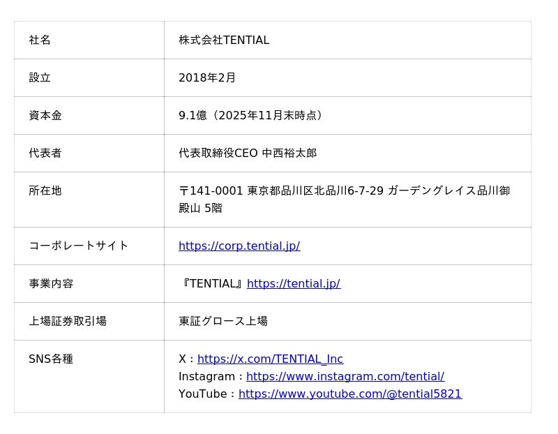 株式会社TENTIALは、「健康に前向きな社会を創り、人類のポテンシャルを引き出す。」をミッションに掲げ、コンディショニングブランド『TENTIAL』を運営しています 。代表取締役CEO中西裕太郎は、プロサッカー選手を目指した高校時代に病気で夢を絶たれた原体験から、自身のポテンシャルを最大限に発揮するためには健康と日々のコンディショニングが不可欠であると痛感。この経験から株式会社TENTIALを創業し、世の中に「コンディショニングを実装する」ことを目指しています。コンディショニングブランド『TENTIAL』は、アスリートの知見と最新技術・研究に基づき、機能性を追求した製品・サービスを提供。24時間365日、日常生活のあらゆるシーンで心身を整え、疲労回復やパフォーマンス向上をサポートするコンディショニング活動を推進しています。すべては個人のコンディションとポテンシャルを引き出すという信念のもと、株式会社TENTIALは、健康に前向きな社会の実現のため、コンディショニングの社会実装に取り組んでまいります。