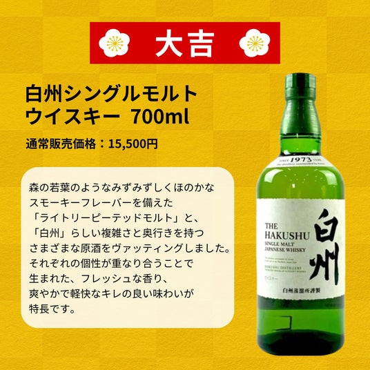 1等は竹鶴25年、2等に山崎12年、3等に白州シングルモルト。ウイスキーみくじ新シリーズが販売開始