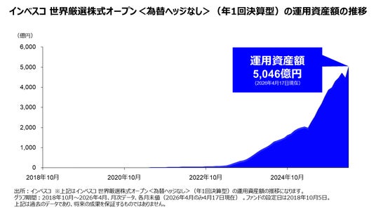 また、NISA成長投資枠対象ファンドであるインベスコ 世界厳選株式オープン<為替ヘッジなし>(年1回決算型)は、2026年4月17日に単体で運用資産額が5,000億円を突破し、5,046億円となり、NISA制度の利用対象ファンドとしても「世界のベスト」が選ばれています。