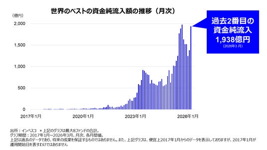 「世界のベスト」は8ファンド合計で、2026年3月末をもって、2017年以降111ヶ月連続で資金純流入を記録するとともに、「世界のベスト」の2026年3月の資金純流入額は、8ファンド合計で1,938億円となり、「世界のベスト」における資金純流入額としても過去2番目の額を記録しております。