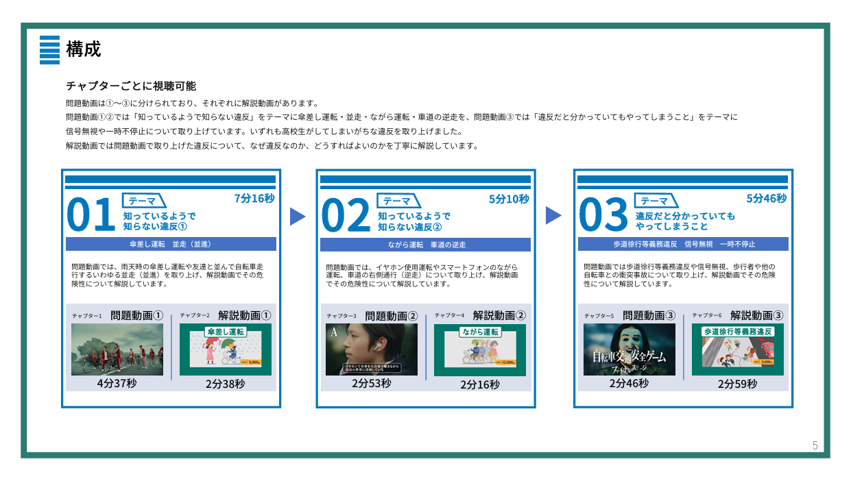 ドラマ仕立ての動画を視聴し、併せて付属資料を活用して授業を行うことで、交通ルールを守る重要性や、日常の何気ない行動に潜む危険を正しく理解できるようになるミステリーゲーム風のコンテンツ。日ごろから交通事故の未然防止活動に取り組んでいるJA共済が、令和8年4月から、自転車へ「交通反則通告制度(通称:青切符)」が導入されることを機に未来を担う若者の健全な育成と安全な環境づくりに貢献することを目的に製作した。【WebサイトURL】https://social.ja-kyosai.or.jp/bicycle_rules01