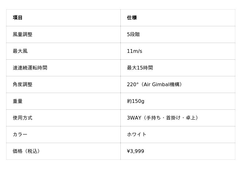 「軽いのに風が弱い」という常識を覆す設計です。本体わずか150g、頭尾等重のバランスで、首掛け時に前後にぶれません。11m/sのターボ送風で、遠距離からでも確かな涼しさ。長時間の外出でも負担になりません。