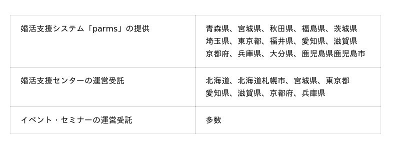 当社は官民一体となって、地方創生や少子化対策を行うことが持続可能な社会の実現につながると考え、当社結婚相談所が有する知見やノウハウを可能な限り、地方の活性化のために生かしていただければと考えております。このため、当社結婚相談所を支える独自開発のマッチングシステムと同等程度の機能を有する「parms」を多くの地方自治体に提供させていただいております。また、これに加えて近年では、婚活支援センターの運営や各種イベント・セミナーの受託も行っております(地方自治体向け3Dオペレーション)。